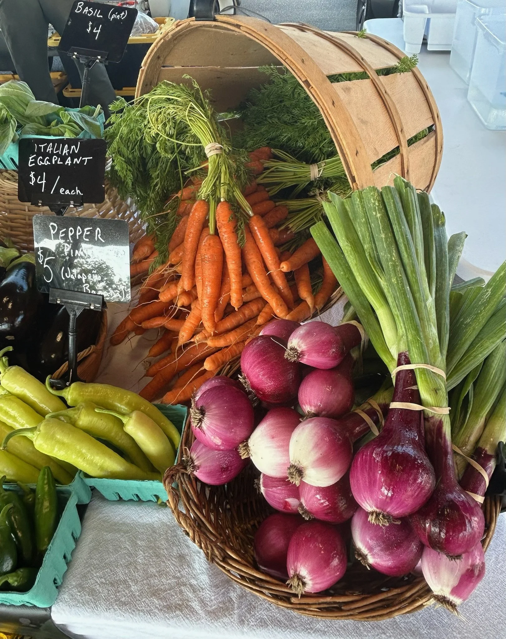 VEG TO EXPECT: arugula, kale, scallions, collards, salad mix, head lettuces (green and red buttercrisps and romaines), pac choi, radishes, turnips, dill, cilantro, parsley, beets (red and candy striped), carrots, fennel, celery, kohlrabi, radicchio, escarole, frisée, chard, broccoli, spring and cured onions (red and yellow), shallots, garlic, cucumbers, cherry tomatoes, early peppers, eggplants, and tomatoes.